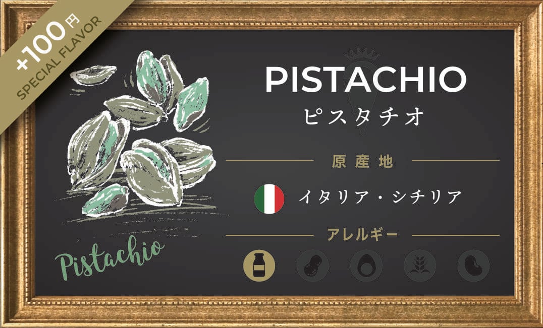 当店人気NO1フレーバー。シチリアピスタチオを何度もすり潰して作られた香り豊かなペーストを使用。イタリアでFLORを人気店へ押し上げたのはこのピスタチオがあってこそ。是非本場の味をお楽しみください。